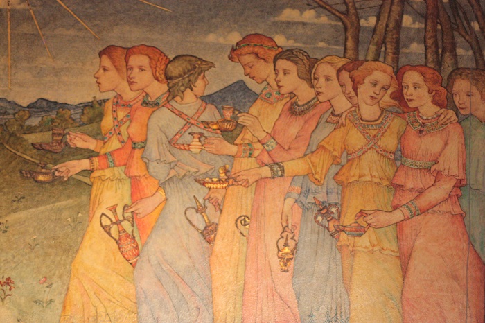 This was a lectio divina Sunday, when there is no formal sermon; instead, we ponder the text together. The text was Matthew 25:1-13: The wise and foolish bridesmaids. I finished by sharing this Zen-like story, adapted from John Shea The Spiritual Wisdom of the Gospels for Christian Preachers and Teachers. Year A. On Earth as it is in Heaven. (Collegeville, MN: Order of Saint Benedict, 2004). The image is by Phoebe Anna Traquair – Own work Stephencdickson, CC BY-SA 4.0, https://commons.wikimedia.org/w/index.php?curid=37847772.