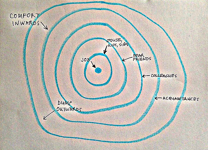 What this means is that if you find it difficult to cope with X’s situation, go and talk with or cry with or vent at someone on a ring further out than you. If you have the capacity to offer love, care, support and a listening ear, pour that capacity into anyone closer in the ring than you: not just the person in the centre, but their nearest and dearest, too. As for the person in the centre, they can weep, moan, rail at God, complain bitterly, go silent, or refuse visitors anytime; and they are not expected to comfort any of us.